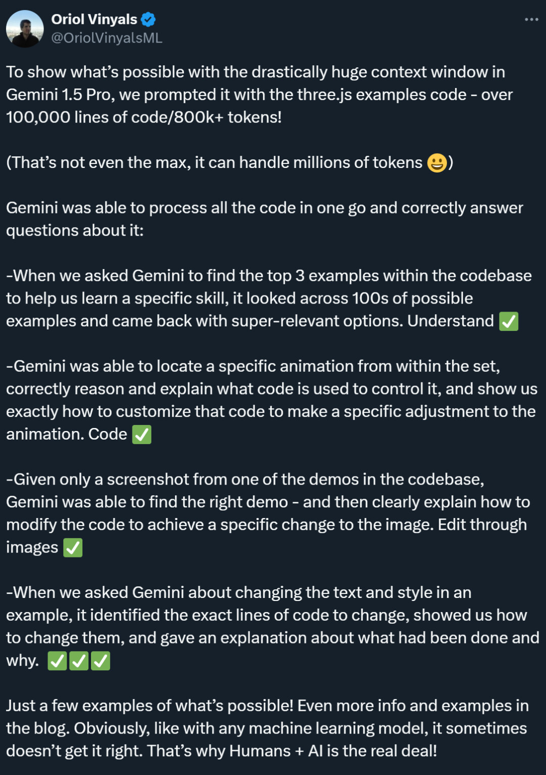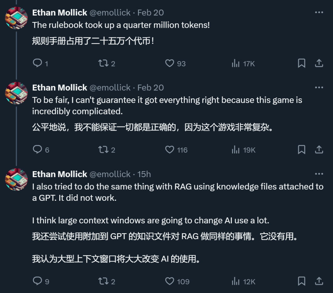 一位 X 网友表示,在他进行的一个测试中,支持超长上下文的 Gemini 1.5 Pro 确实做到了 RAG 做不到的事情。