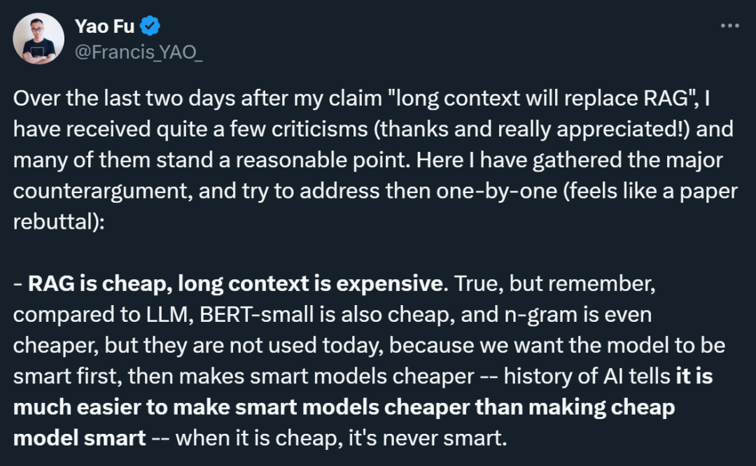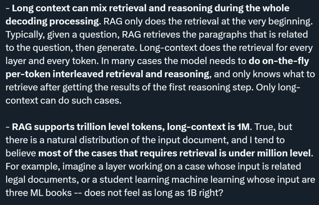 总体来看,他不认为长上下文模型能取代 RAG,理由包括: