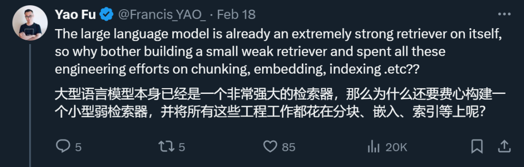 符尧认为,如果一个模型可以直接处理 1000 万 token 的上下文信息,就没有必要再通过额外的检索步骤来寻找和整合相关信息了。用户可以直接将他们需要的所有数据作为上下文放入模型中,然后像往常一样与模型进行交互。「大型语言模型本身已经是一个非常强大的检索器,为什么还要费力建立一个弱小的检索器,并在分块、嵌入、索引等方面耗费大量工程精力呢?」他继续写到。