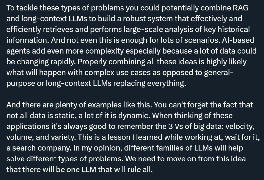 3、@elvis 提出,为了解决这些类型的问题,可以将 RAG 和长上下文 LLM 结合起来,构建一个强大的系统,有效且高效地检索和分析关键的历史信息。他强调,即使这样,在许多情况下也可能不足够。特别是因为大量数据可能会迅速变化,基于 AI 的智能体增加了更多的复杂性。@elvis 认为,对于复杂的用例,很可能会结合这些想法,而不是通用或长上下文 LLM 取代一切。