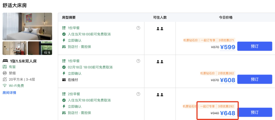 套餐用满498-50的券,券后274元/晚。春节期间含双早的同款日历房价要648元/晚,套餐4折!
