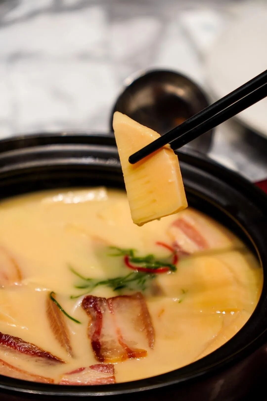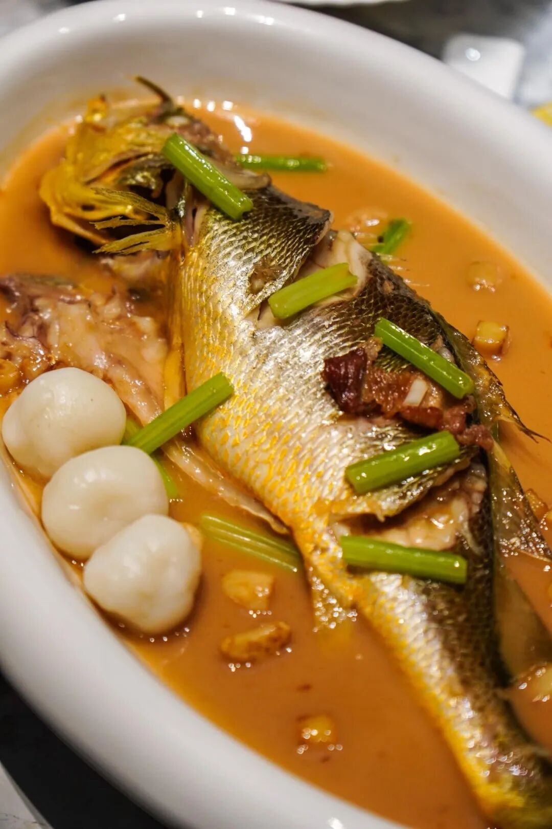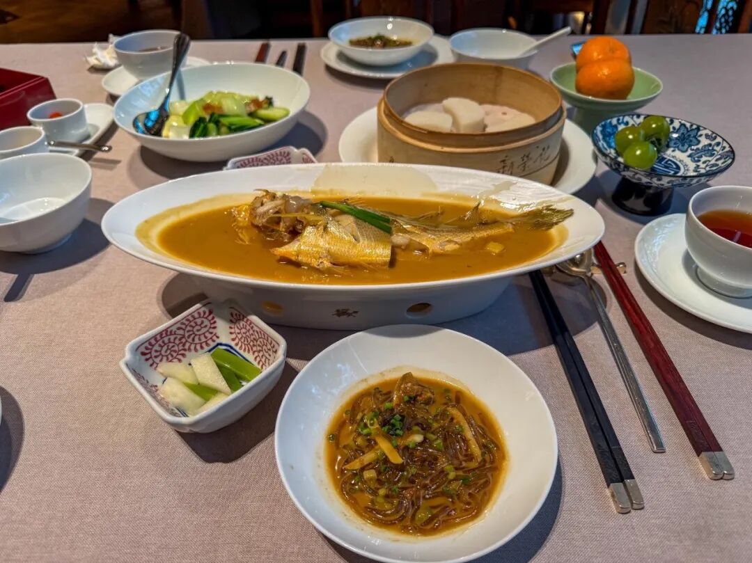 家烧大汤黄鱼配圆年糕是是台州菜的灵魂招牌,用朴素的“家烧”技法,激发东海黄鱼极致的本味之鲜。