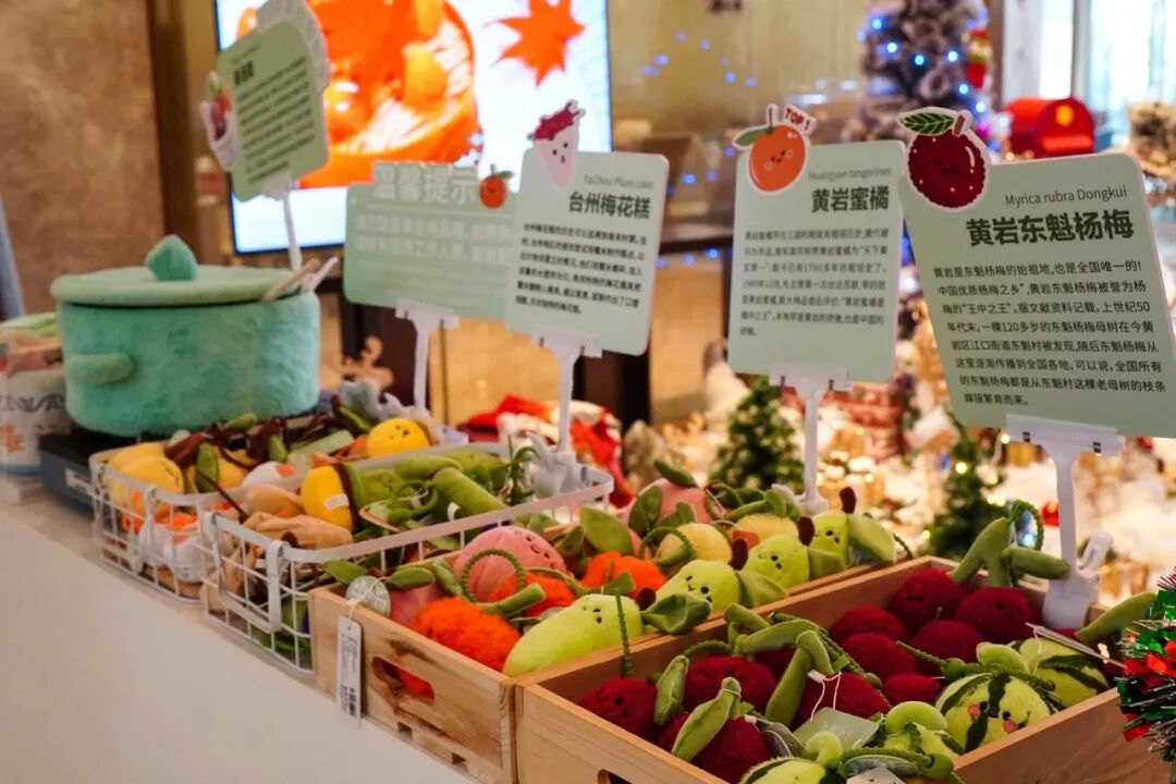 餐厅门口还有隐藏彩蛋——那里摆放着以各种当地特色美食为造型的毛绒玩具,比如梅花糕、杨梅等,软萌可爱。