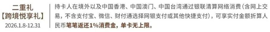 持卡人在境外以及中国香港、中国澳门、中国台湾通过银联清算网络消费(含网上交易,不含支付宝、微信、财付通选择网银支付或其他快捷支付),可享实付金额折算人民币笔笔返还1%消费金,单卡无上限。