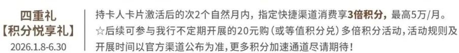 卡片激活后的次2个自然月内,指定快捷渠道消费享5倍积分,最高5万/月。后续可参与20元购多倍积分活动。