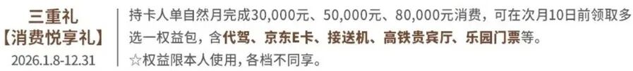 消费3万元:代驾、京东卡,高铁贵宾厅等择其一;