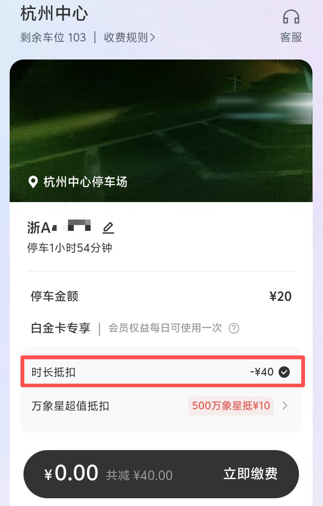 例如元旦帅帅去了杭州的“杭州中心”商场(也是华润旗下的)。停车费20元,该商场对于白金卡会员的待遇是免费停车4小时,所以这次停车免费!