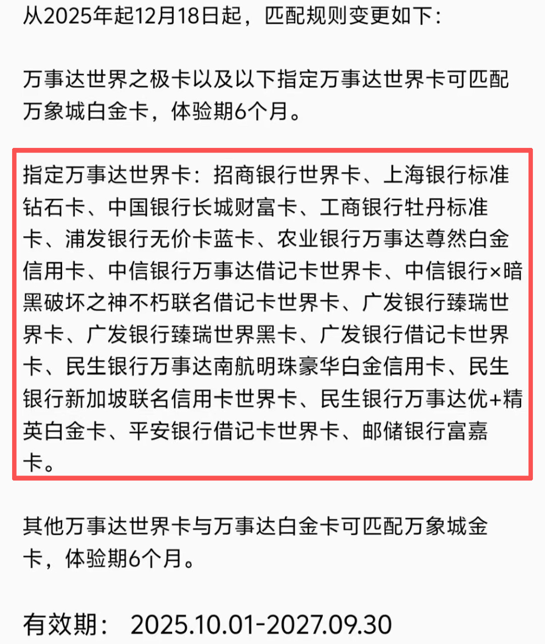由原先全部世界卡可匹配万象城白金卡调整为“指定世界卡匹配万象城白金卡”。指定的世界卡包括:
