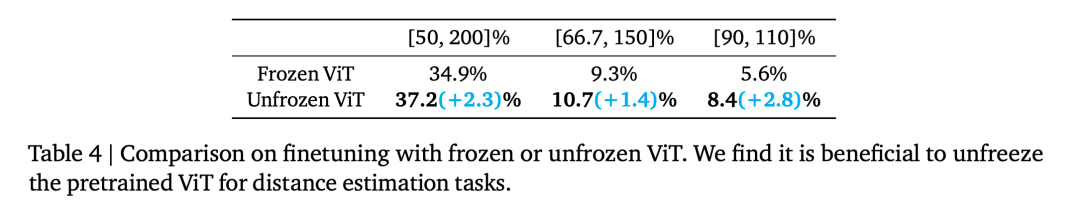 Frozen ViT (在对比目标上进行训练) 是否编码了足够的信息来进行空间推理?为了探索这一点,研究者的实验从第 110,000 步的训练开始,分成两个训练运行,一个 Frozen ViT,另一个 Unfrozen ViT。通过对这两个模型进行了 70,000 步的训练,评估结果如表 4 所示。