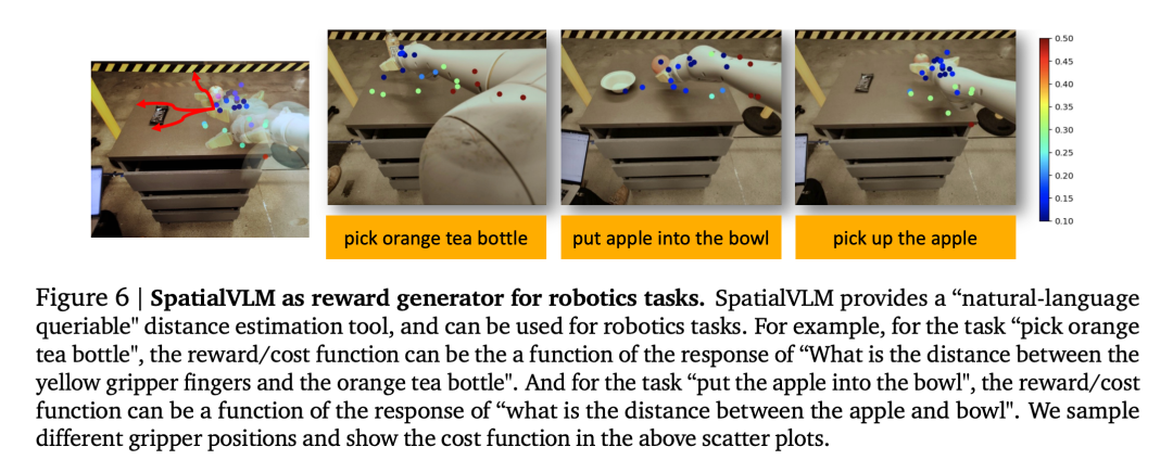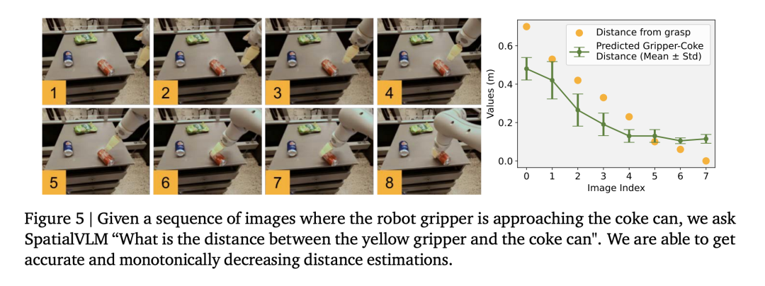 研究者者使用机器人操作数据集训练视觉语言模型,发现模型能够在操作领域进行精细的距离估计 (图 5),进一步证明了数据的准确性。