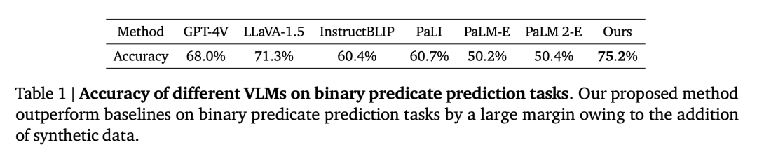 研究者通过使用 PaLM-E 训练集和本文设计的空间 VQA 数据集的混合来训练模型。为了验证 VLM 在空间推理上的局限是否是数据问题,他们选择了当前最先进的视觉语言模型作为基线。这些模型的训练过程中语义描述任务占据了相当的比重,而不是使用本文的空间 VQA 数据集进行训练。
