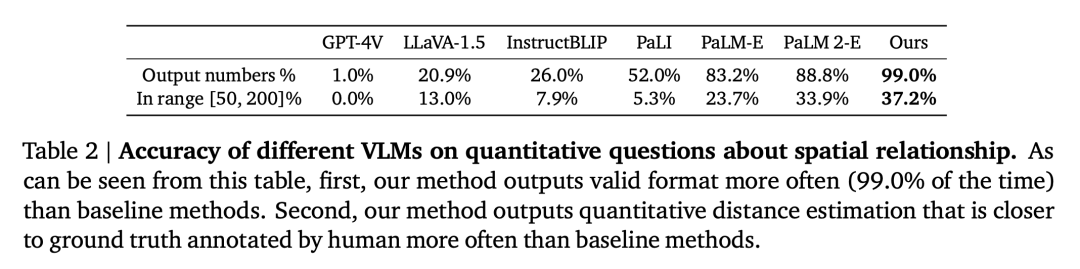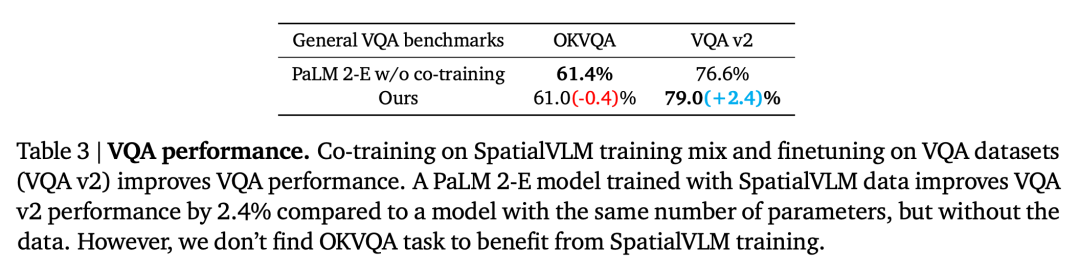 第二个问题是,由于与大量的空间 VQA 数据共同训练,VLM 在其他任务上的表现是否会因此而降低。通过将本文模型与在通用 VQA 基准上没有使用空间 VQA 数据进行训练的基本 PaLM 2-E 进行了比较,如表 3 所总结的,本文的模型在 OKVQA 基准上达到了与 PaLM 2-E 相当的性能,其中包括了有限的空间推理问题,并且在 VQA-v2 test-dev 基准上表现略好,该基准包含了空间推理问题。