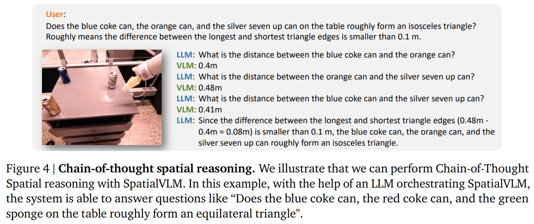 研究者还研究了 SpatialVLM 是否能够用于执行需要多步推理的任务,考虑到它对基本空间问题的增强回答能力。作者在图 1 和图 4 中展示了一些例子。当大语言模型 (GPT-4) 装备有 SpatialVLM 作为空间推理子模块时,可以执行复杂的空间推理任务,比如回答环境中的 3 个对象是否能够形成「等腰三角形」。