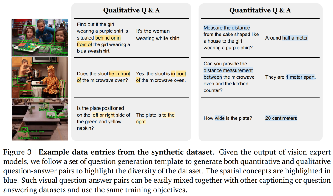 图 3 展示了本文获取的合成问答对的示例。研究者创建了一个包括 1000 万张图像和 20 亿个直接空间推理问答对 (50% 是定性问题,50% 是定量问题) 的庞大数据集。