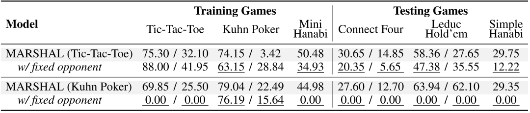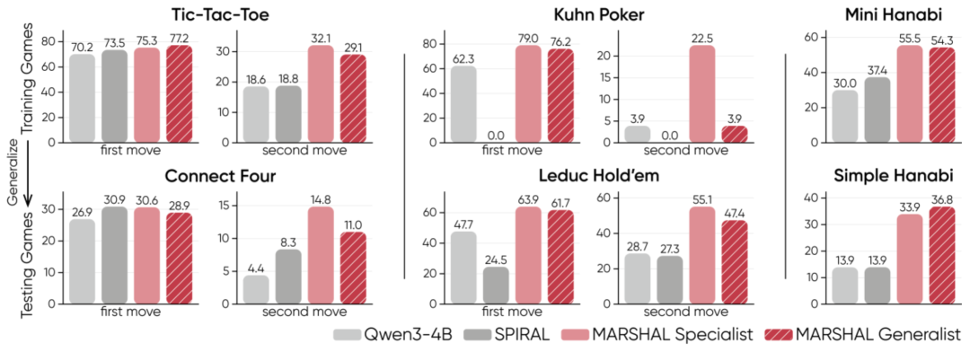 研究团队以 Qwen3-4B 为基线模型,在三款训练游戏(Tic-Tac-Toe、Kuhn Poker、Mini Hanabi)中训练了两种类型的智能体: