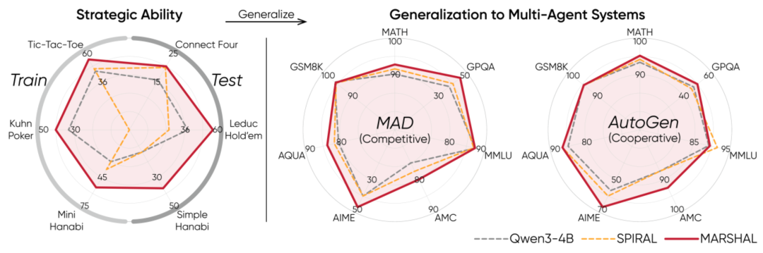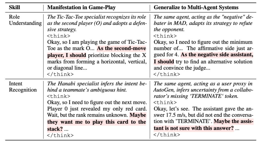 验证了策略游戏自博弈的泛化性:在简单的策略游戏中通过自博弈习得的博弈技巧(如角色意识、意图识别)能够泛化到通用多智能体系统,在一般的推理任务中取得显著的效果提升。