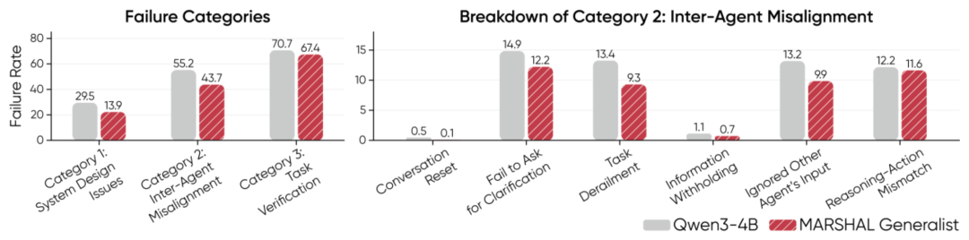 定量分析(Quantitative Analysis):为了进一步量化 MARSHAL 带来的多智能体推理能力的提升,研究团队对多智能体系统进行了失败模式分析。结果显示,MARSHAL 将智能体间未对齐(Inter-Agent Misalignment)的情况减少了 11.5%,显著提升了模型在跨智能体的沟通效率和理解能力。