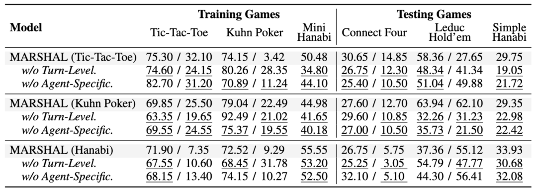研究团队通过逐步移除核心算法组件,验证了 MARSHAL 算法设计的必要性:1)轮次级优势估计的精细信用分配是处理长序列决策的关键;2)分角色归一化在角色回报差异大的竞争性游戏中(如 Tic-Tac-Toe)影响巨大,而在角色回报分布相似的合作游戏(如 Hanabi)中影响则相对较小。