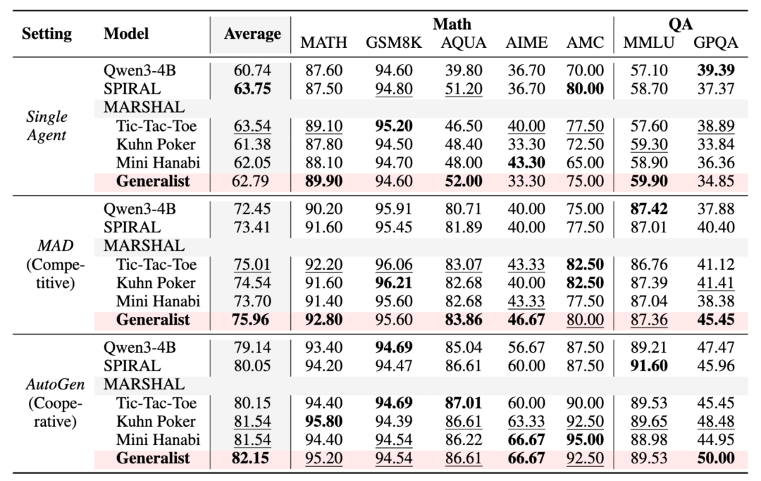 在策略游戏中习得的多智能体博弈能力,能够跨域泛化到通用的多智能体系统中,提升系统在一般推理任务中的表现。综合表现最强的 MARSHAL 通用智能体在数学测试 AIME 和问答测试 GPQA 中分别取得高达 10.0% 和 7.6% 的提升;在所有测试中的平均提升高达 3.5%。