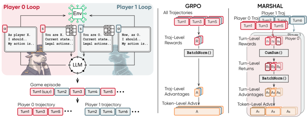 面向策略游戏自博弈中多轮次、多智能体训练的挑战,MARSHAL 基于 Group-Relative Policy Optimization (GRPO) 架构,提出了两项关键算法改进: