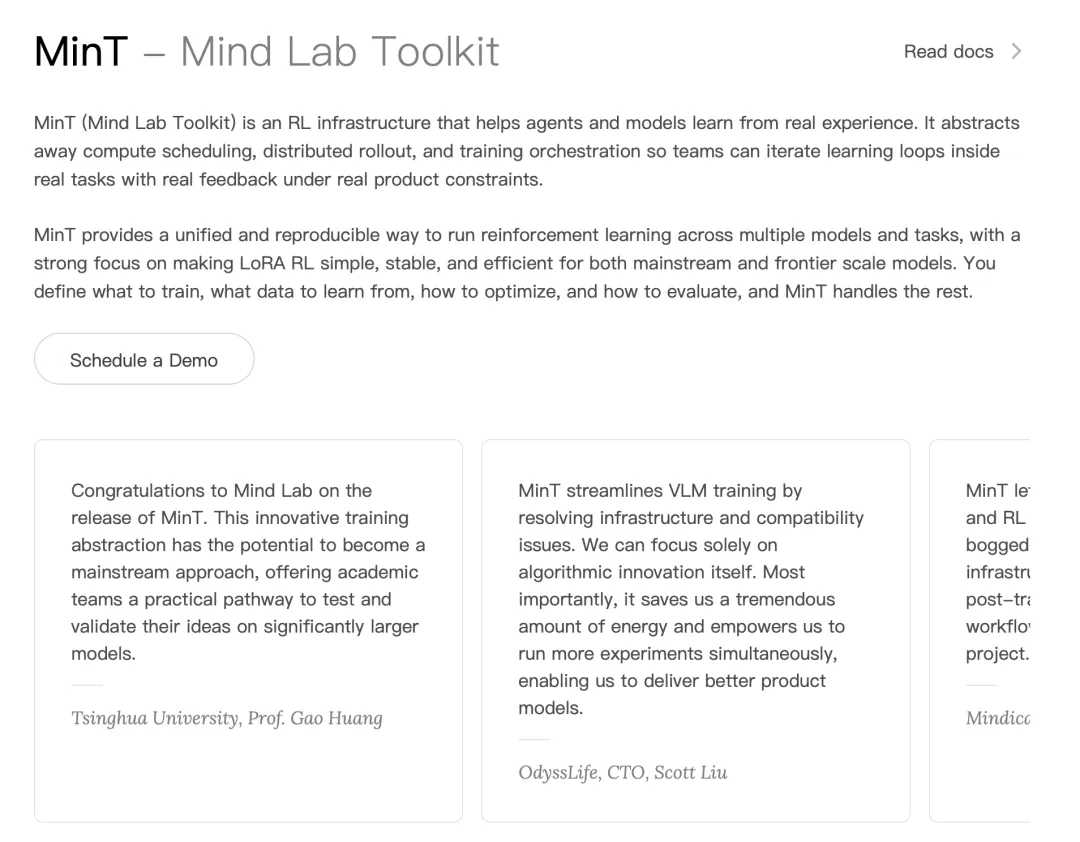 Tinker 在海外大火的同时,国内也涌现出了对标甚至超越的力量 ——Mind Lab 推出的 MinT(Mind Lab Toolkit)。