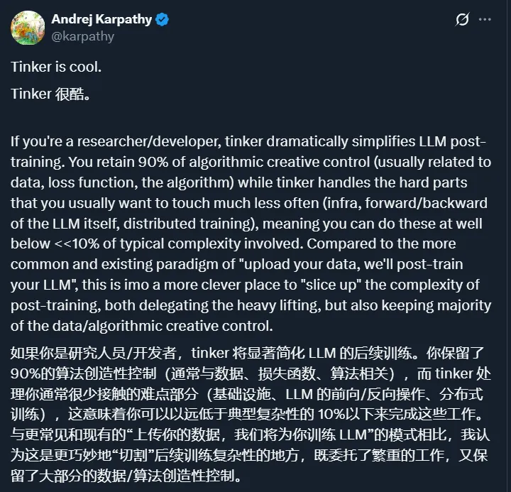 好在,国内外都有专业团队在关心这个问题,比如前 OpenAI CTO Mira 创办的 Thinking Machines Lab,前段时间就推出了一个叫「Tinker」的产品,专注于解决后训练 Infra 的复杂性。