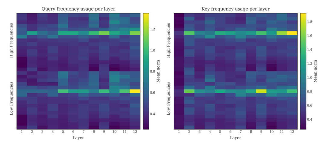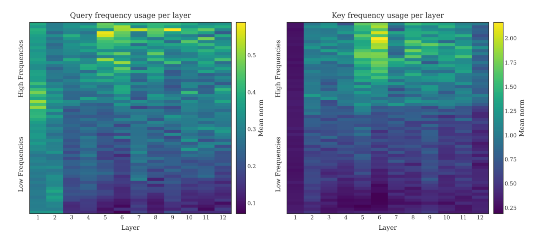 过往针对 RoPE 的研究(如 Gemma 7B)发现,模型倾向于主要利用低频分量,而高频分量往往因被视为噪声而受到抑制。
