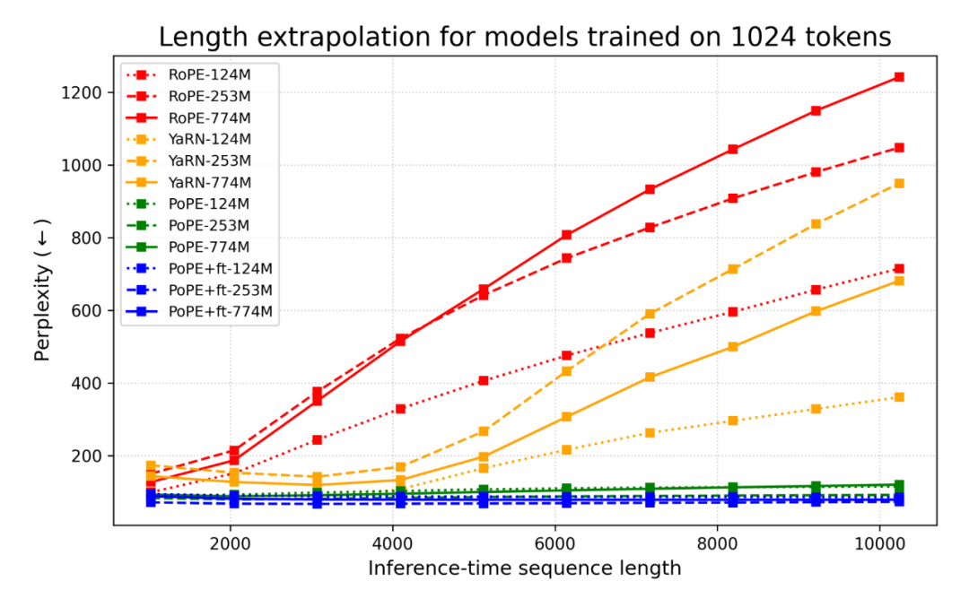 RoPE (红线):当推理长度超过训练长度(1024)时,PPL 显著上升,表明模型难以适应未见过的相对距离。
