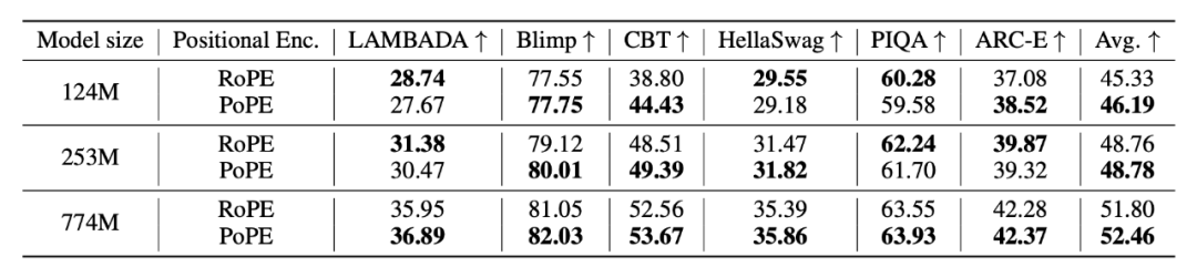 在包括 LAMBADA、HellaSwag 在内的多个下游任务零样本评估中,PoPE 同样取得了更高的平均准确率: