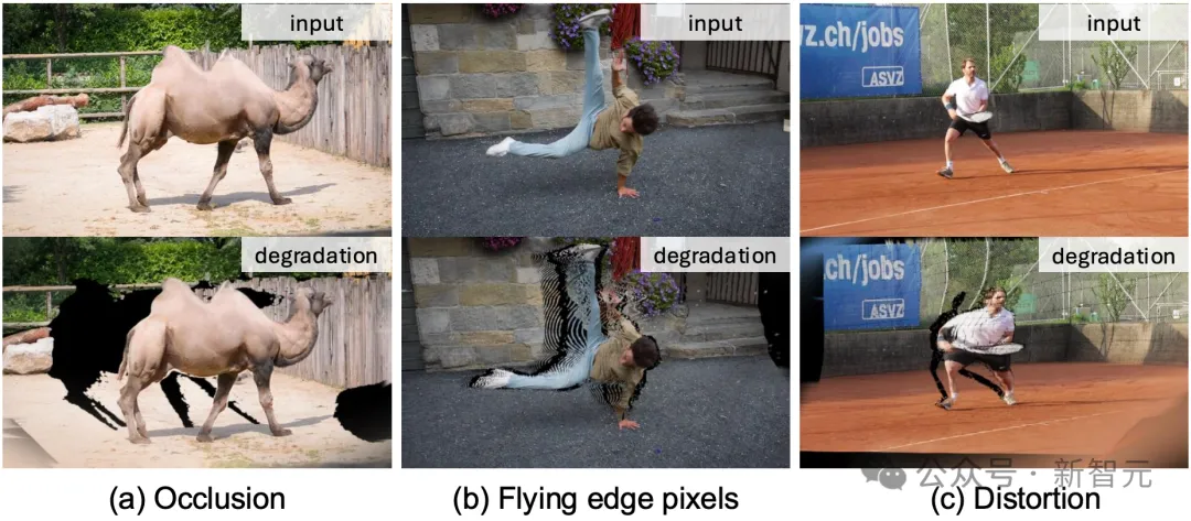 平均几何滤波(Average Geometry Filter): 除了遮挡之外,另一种典型的退化模式是深度不连续的飞行边缘像素。NeoVerse 通过在采样的新视角上渲染深度图并作平均滤波,再根据滤波后的深度值调整每个高斯基元的位置。当调整位置后的高斯重新渲染回原视角,则能模拟出现飞边现象(图(b))。当增大平均滤波核半径时,则能模拟出更大范围的空间畸变(图(c))。