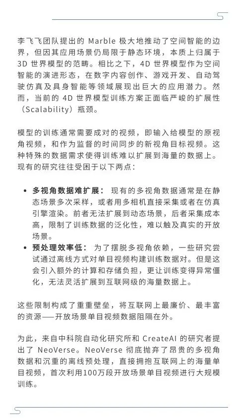 来源:新智元本文约2700字,建议阅读5分钟当全行业还在为昂贵的多视角数据焦头烂额时,中科院和CreateAI重磅推出NeoVerse,直接用百万单目视频砸开了4D世界模型的大门,让AI真正学会了理解开放世界。