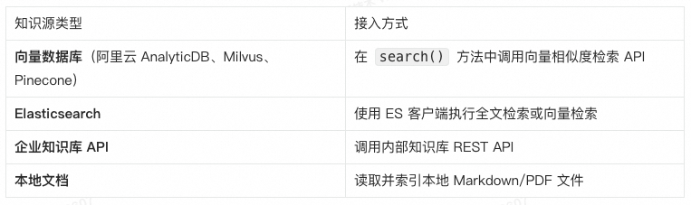 💡 框架默认提供 Mock 知识库实现用于演示测试。生产环境需要接入真实知识源(如向量数据库、Elasticsearch、企业知识库 API 等),以便 Agent 能够检索并回答业务相关问题。
