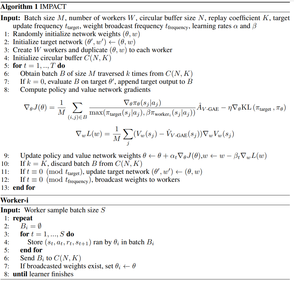 经典强化学习 agent 的实际使用往往受到训练时间的限制。为了加速训练,转而提出了分布式强化学习架构来并行化及加速训练过程。上文介绍的 IMPALA 可以实现更高的吞吐量,因为它可以异步收集 workers 的样本。但是,IMPALA 的采样效率较低,因为它无法像 PPO 那样安全地在每个批次采取多个 SGD 步骤。因此,随着样本吞吐量的不断增加,样本的学习效率往往会下降。为解决这个问题,本文提出了经典的 IMPACT(Importance Weighted Asynchronous Architectures with ClippedTarget Networks),从三个方面扩展了 IMPALA: