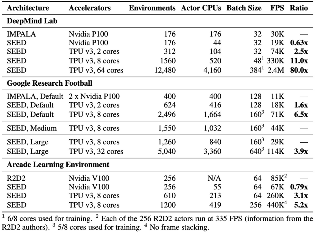 表 3. SEED、IMPALA 和 R2D2 的性能