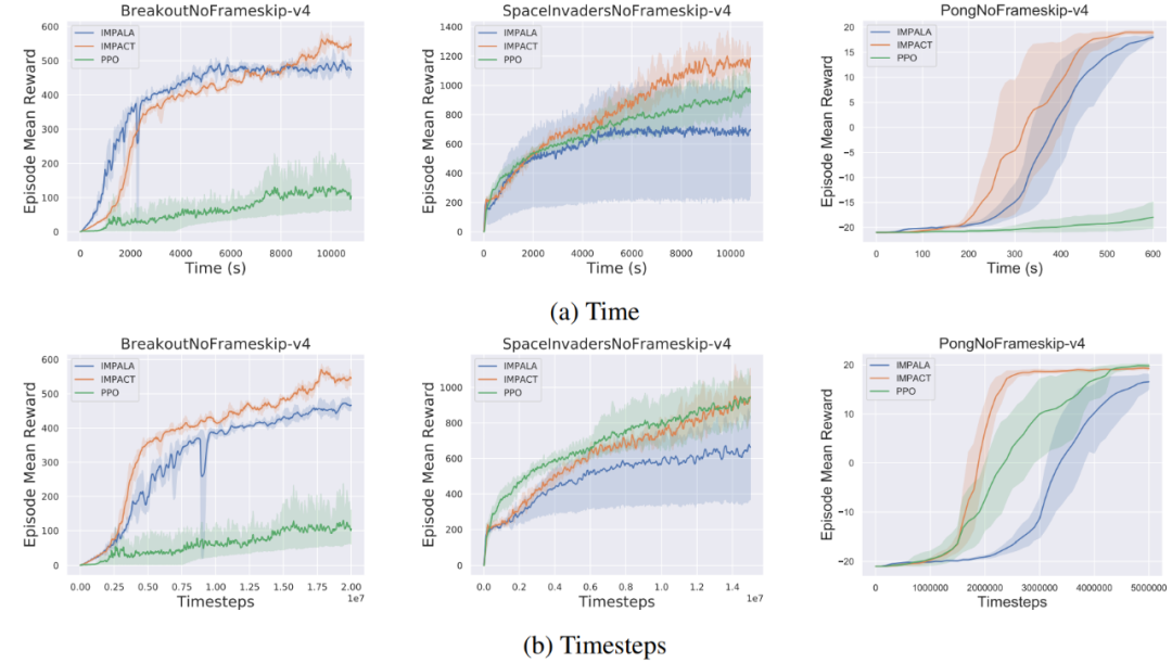 图 13. 在离散控制域方面,IMPACT 的实时性和采样效率均优于 PPO 和 IMPALA:Breakout、SpaceInvaders 和 Pong