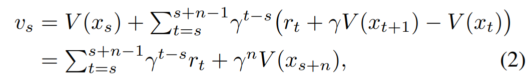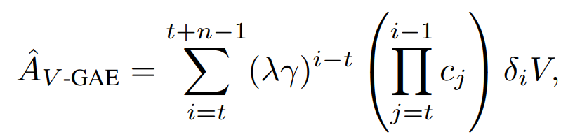其中,δ_t V 表示 V 的时间差,ρ_t 和 c_i 为截断重要度抽样 (IS) 权重。在 on-policy 的情况下(当 π = µ 时),假设 c¯≥ 1,则所有 c_i = 1,ρ_t = 1,此时式 (1) 改写为: