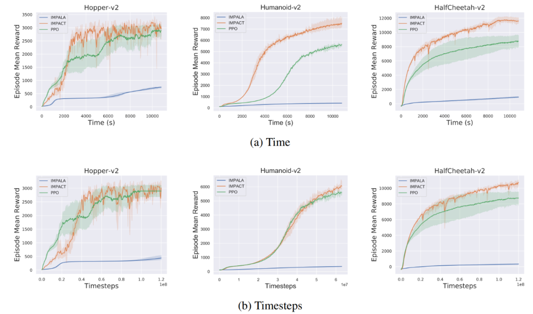在离散环境中,IMPACT 获得了更高的奖励,与 IMPALA 相比,训练时间减少 30%,在连续环境中,比现有的可扩展 agent 训练更快,同时保持同步 PPO 的样本效率(样本的学习质量)。
