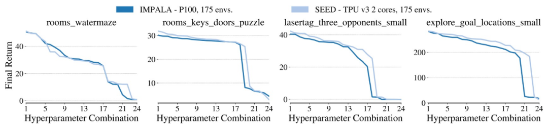图 17. IMPALA 和 SEED 在完全相同的条件下(175 个 actor、相同的超参数等)的比较,图中显示的超参数组合按不同超参数组合的最终性能排序