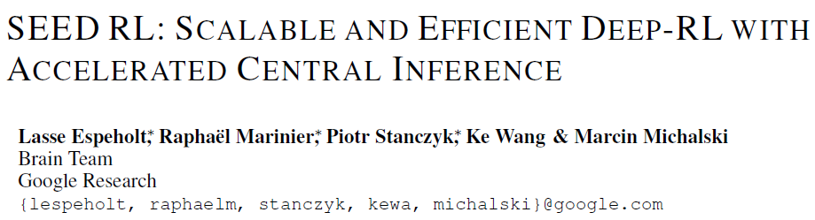[4] SEED RL: SCALABLE AND EFFICIENT DEEP-RL WITH ACCELERATED CENTRAL INFERENCE,https://arxiv.org/pdf/1910.06591.pdf