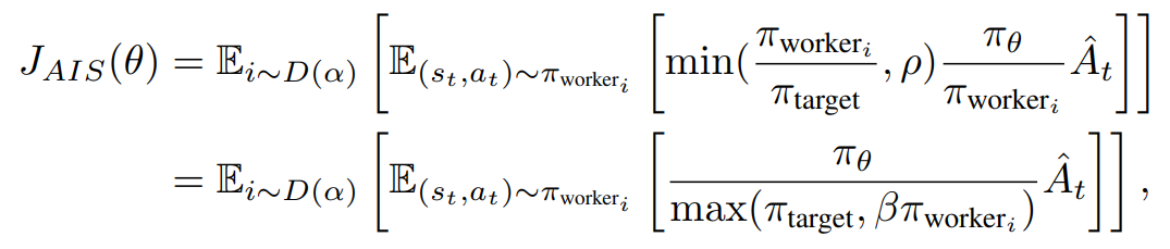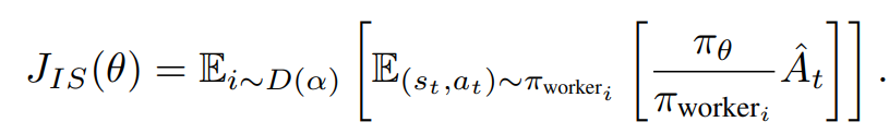 PPO 从上一次迭代的策略 π_θ_old 中收集经验,并通过重要性采样 off-policy 经验来训练当前策略与 π_θ 的关系。在异步设置中,worker i 的策略(记为 π_worker_i)为策略网络 π_θ 生成经验。批次 B 来自 worker i 的概率可被参数化为分类分布 i ∼ D(α_1, ..., α_n)。作者通过在重要性取样策略梯度目标(IS-PG)中添加一个额外的期望值来实现这一点: