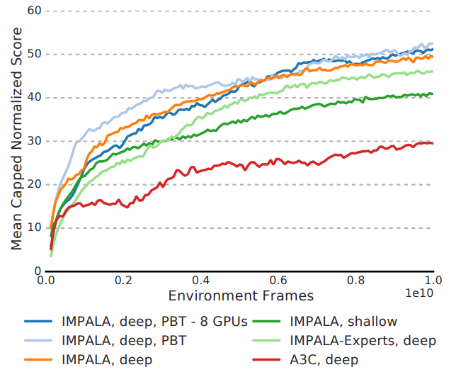 表 2 和图 7 显示,所有 IMPALA 变体的性能都远远优于深度分布式 A3C。此外,IMPALA 的深度变体不仅在最终性能方面,而且在整个训练过程中都比浅层版本表现得更好。表 2 显示,虽然 IMPALA、deep、PBT 的 8 个 learner 提供了更高的吞吐量,但其最终性能与 1 GPU 的 IMPALA、deep、PBT 在相同步数下的性能相同。特别重要的是,IMPALA 专家对每个任务进行单独训练,而 IMPALA deep PBT 则对所有任务进行一次性训练,两者之间的差距非常明显。
