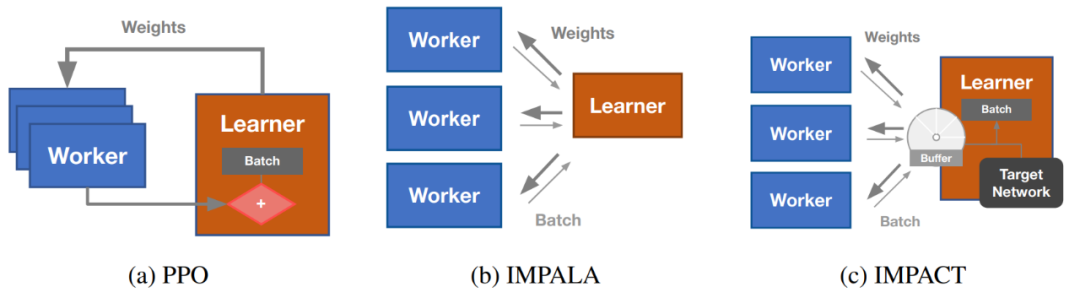 图 8. 分布式 PPO、IMPALA 和 IMPACT 的架构方案。PPO 将 worker batches 聚合到一个大的训练批次中,learner 执行小批量 SGD。IMPALA worker 异步生成数据。IMPACT 由一个批次缓冲区组成,该缓冲区接收 worker 的经验和目标对经验的评估。learner 从缓冲区中采样