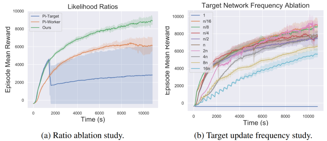 损失函数 R3 表明,clipping 是必要的,有助于促进训练。通过限制目标与 worker 的比例,我们可以确保该比例不会爆炸,也不会破坏训练的稳定性。此外,通过目标网络提供单一指导,还能防止 worker 提出相互破坏的建议。在图 11(b)中,作者测试了 n 的不同数量级的更新频率。作者发现 agent 性能对不同的频率是稳健的。当 n = 1 ∼ 4 时,agent 不学习。根据经验结果,作者推测只要能形成稳定的信任区域,agent 就能进行训练。反之,如果更新频率过低,agent 就会在同一信任区域反复多次,从而影响学习速度。