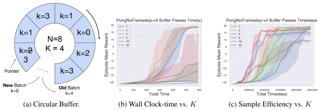 图 11. (a): Circular Buffer 简述:N 和 K 分别对应缓冲区大小和每个批次的最大遍历次数。旧批次由 worker 生成的批次取代。(b): IMPACT 在不同 K 条件下的时间性能。(c): 不同 K 的 IMPACT 在时间步长方面的性能。K = 2 在时间上优于所有其他设置,并且比 K = 1、4、16、32 更有效率