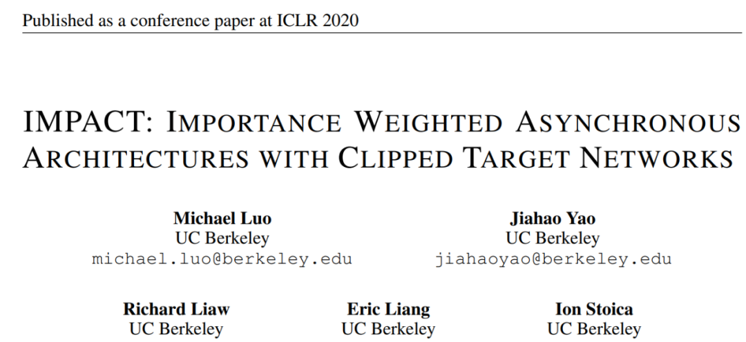 IMPACT 是由来自 UC Berkeley AMPLab 的研究人员所提出。AMPLab(Algorithms, Machines, and People)是 UC Berkeley 的大数据实验室。AMPLab 身兼实验室和孵化器的双重身份,成为了学术界与工业界跨界典范。它有 Spark、Alluxio、Mesos 等熠熠生辉的孵化成果。关于 IMPACT 的研究成果发表在 ICLR 2020 中。ICLR 是深度学习方面的顶级会议,ICLR 2020 在埃塞俄比亚首都亚的斯亚贝巴举办,最终 2594 篇论文中共有 687 篇被接收,录取率为 26.5%