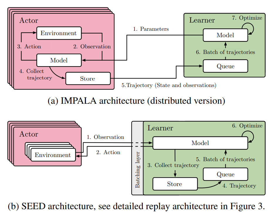 2.3 SEED RL: SCALABLE AND EFFICIENT DEEP-RL WITH ACCELERATED CENTRAL INFERENCE [4]