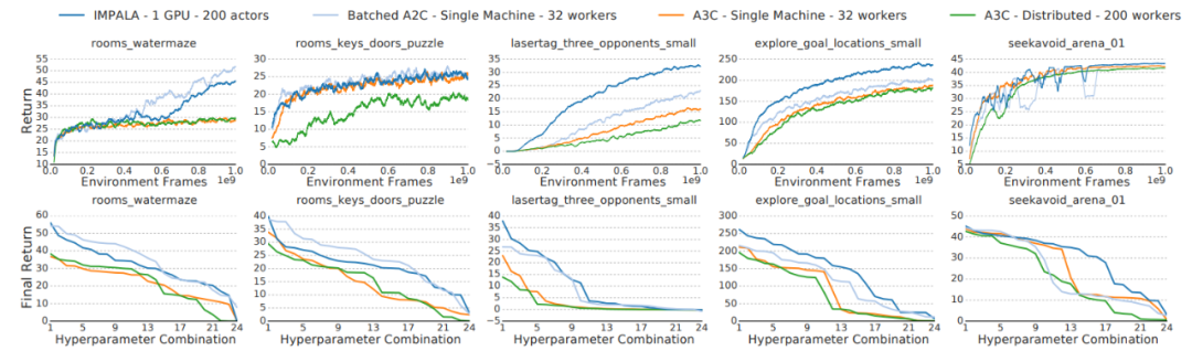 图 6. 上行:在 5 个 DeepMind 实验室任务上进行单任务训练。每条曲线都是基于最终奖励的最佳 3 次运行的平均值。IMPALA 的性能优于 A3C。下行:不同超参数组合的稳定性,按不同超参数组合的最终性能排序。IMPALA 始终比 A3C 更稳定