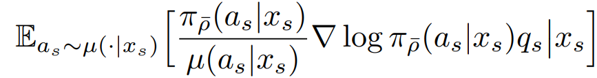 其中,q_s 是 Q^µ(x_s, a_s) 的估计值,并在某些行为策略下访问的状态 x_s 的集合上求平均值。现在,在我们考虑的 off-policy 设置中,可以使用正在评估的策略 π_ρ¯ 和行为策略 µ 之间的 IS 权重,以更新方向中的策略参数: