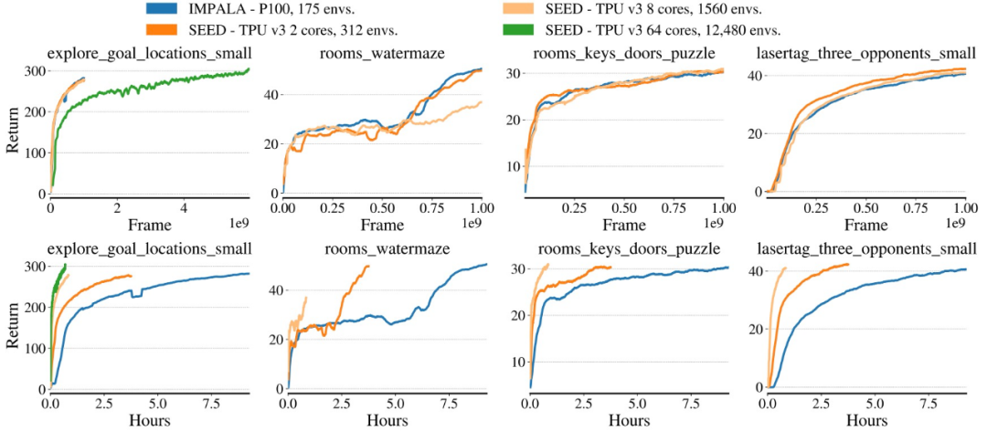 图 18. 4 项 DeepMind 实验室任务的训练。每条曲线都是按照 [7] 中的评估程序,根据最终奖励计算出的 24 次运行中的最佳结果。样本复杂度最高保持在 8 TPU v3 内核,这使得训练速度比 IMPALA 基线快 11 倍。上行:X 轴为每帧(帧数 = 4x 步数)。下行:X 轴为小时数
