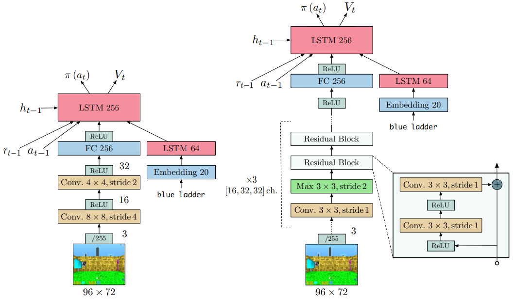 作者实验验证了 IMPALA 在多种设置下的性能。在数据效率、计算性能和 off-policy 校正的有效性方面,具体研究了在单个任务上训练的 IMPALA agent 的学习行为。在多任务学习方面,在新引入的 30 个 DeepMind 实验室任务集和 the Atari 学习环境的全部 57 个游戏上训练 agent— 每个 agent 在所有任务中都使用一组权重。在所有实验中,使用了两种不同的模型架构:一种是在策略和价值之前使用 LSTM 的浅层模型(如图 5(左)所示),另一种是更深层的残差模型(如图 5(右)所示)。